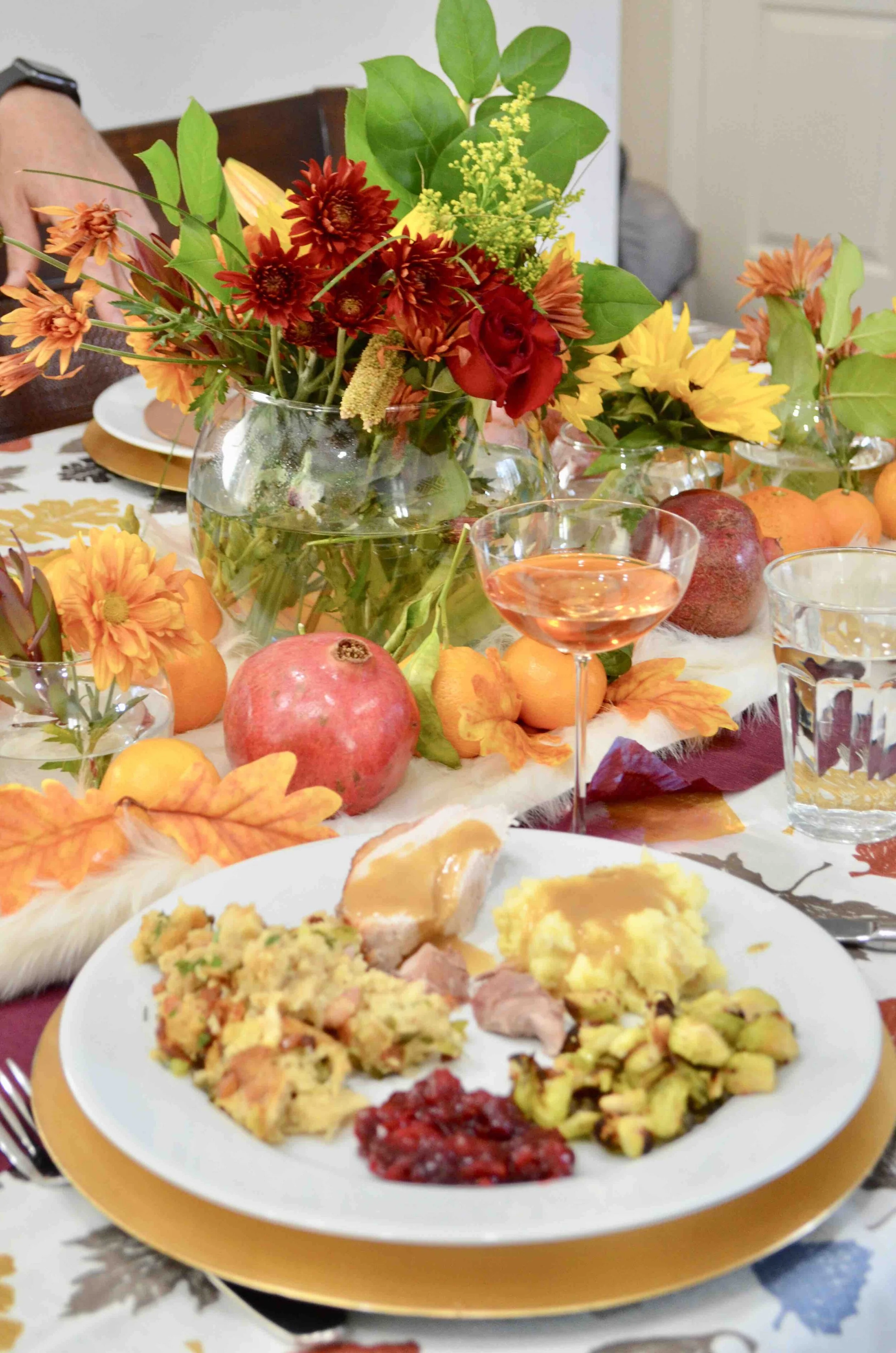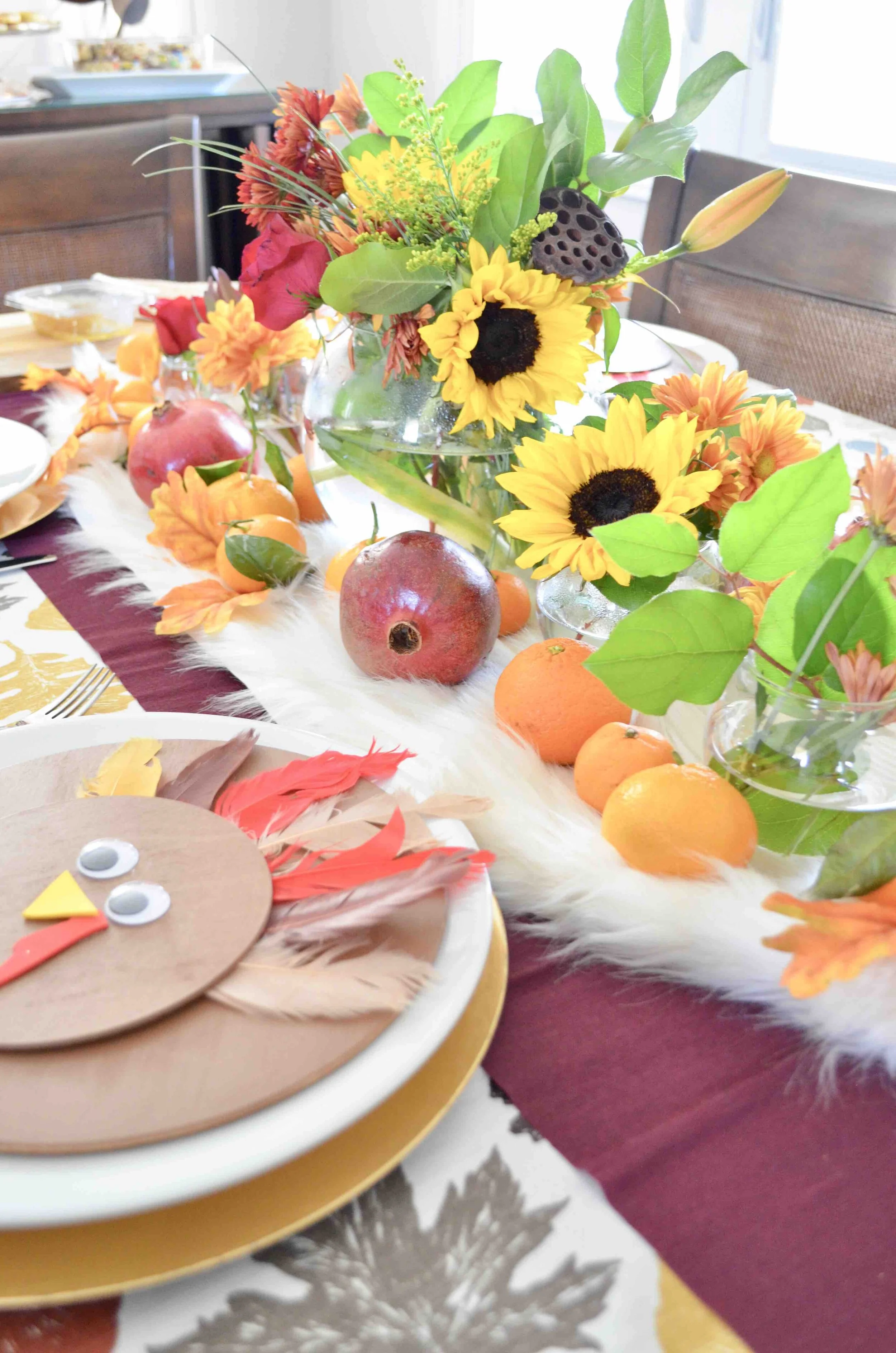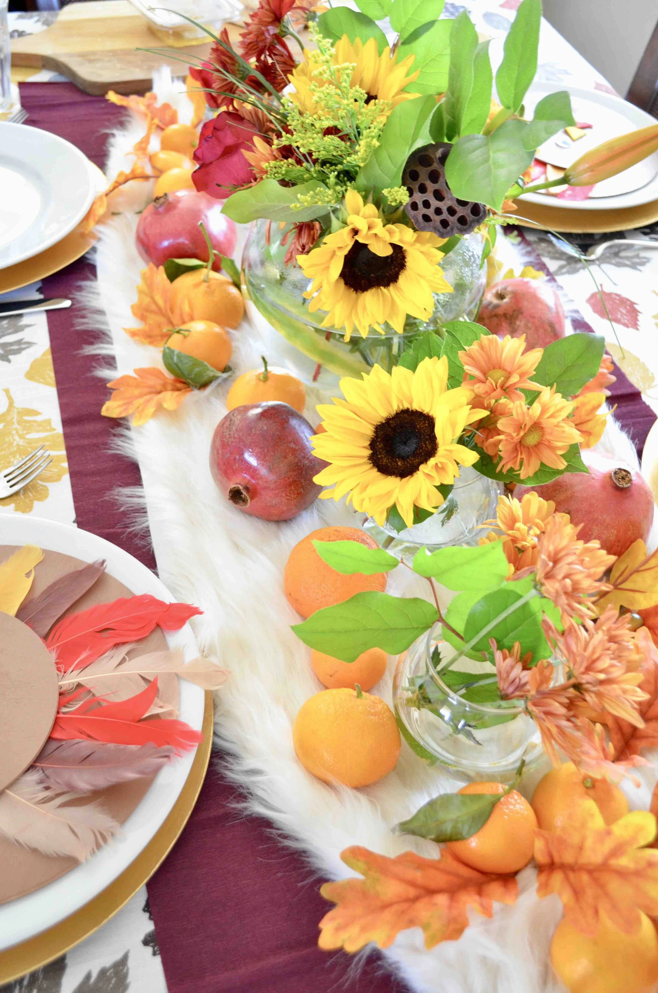 If you walk away with any tip at all from this, it’s to layer!! Layer, layer, layer! I used a table cloth with two different runners, all are different colors and textures. The flowers and fruit are all different heights and spread between a number of vases to take up as much space as possible, AND, get some chargers! Yes, I know it’s a plate for a plate, but they make a huge difference without costing a lot! The fall colors are essential to Thanksgiving, in my opinion, plus they create such a warm and welcoming feel.