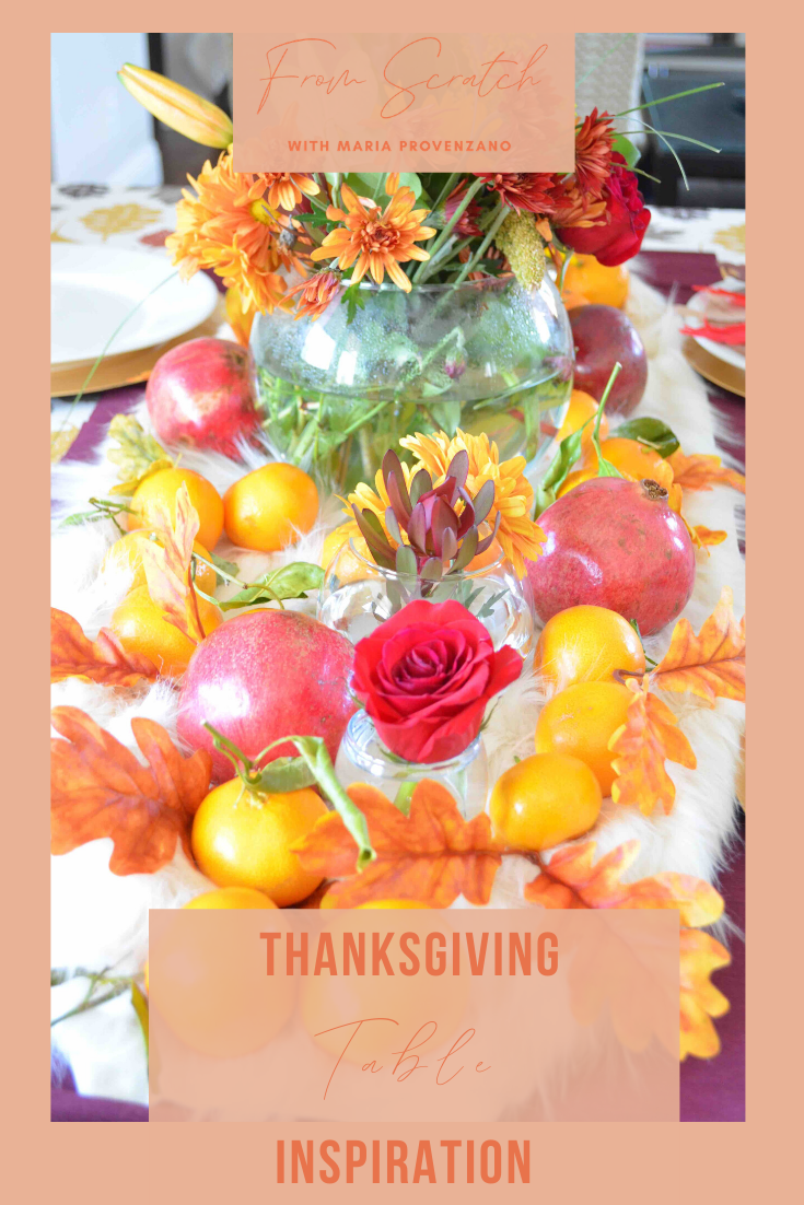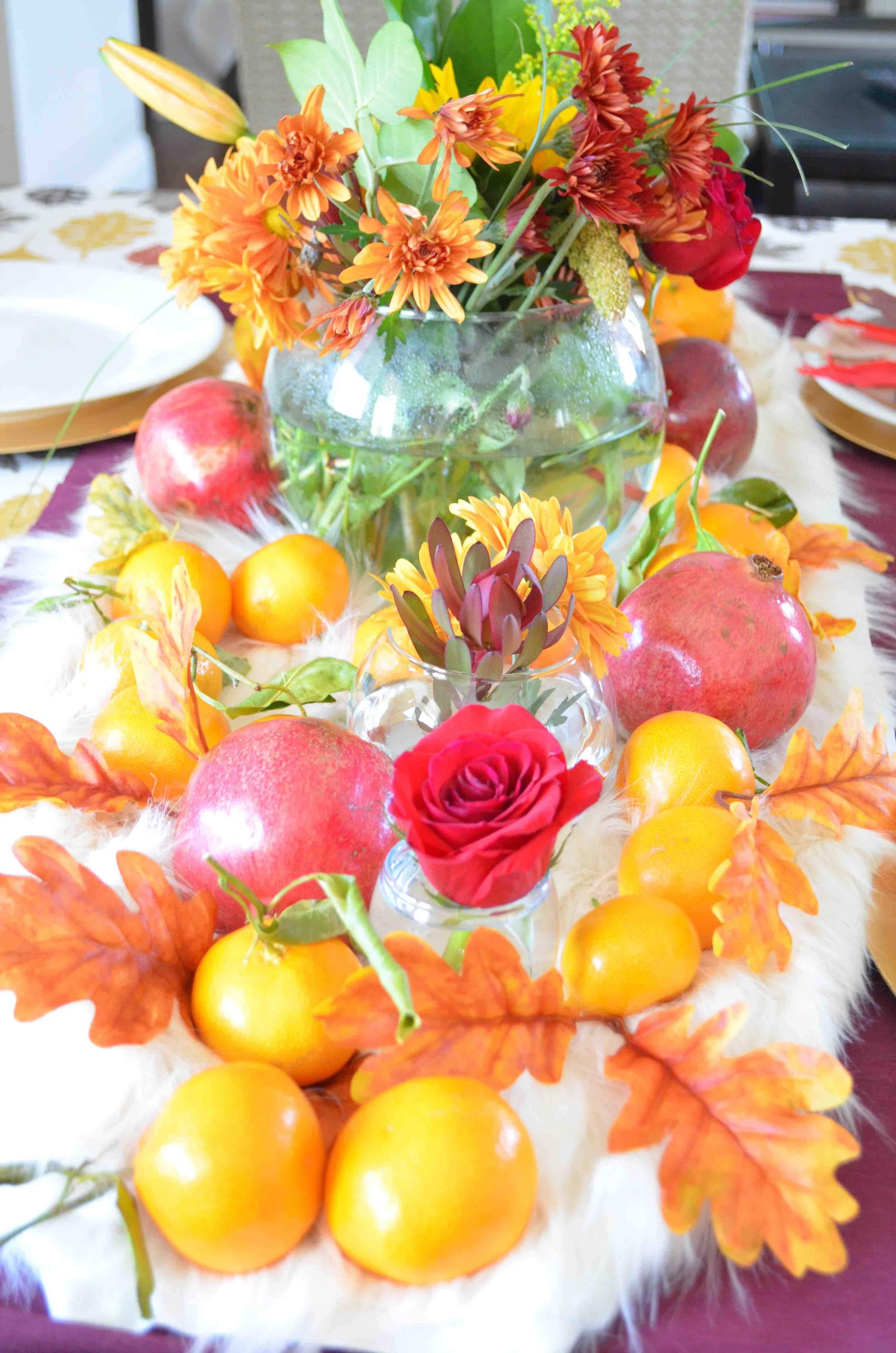 I wanted it to feel rich and colorful. I LOVE the idea of adding food to a centerpiece. So, I sprinkled around fresh oranges and pomegranates for color and texture. The touch of green to the flowers in the centerpiece adds such a “fresh” look.