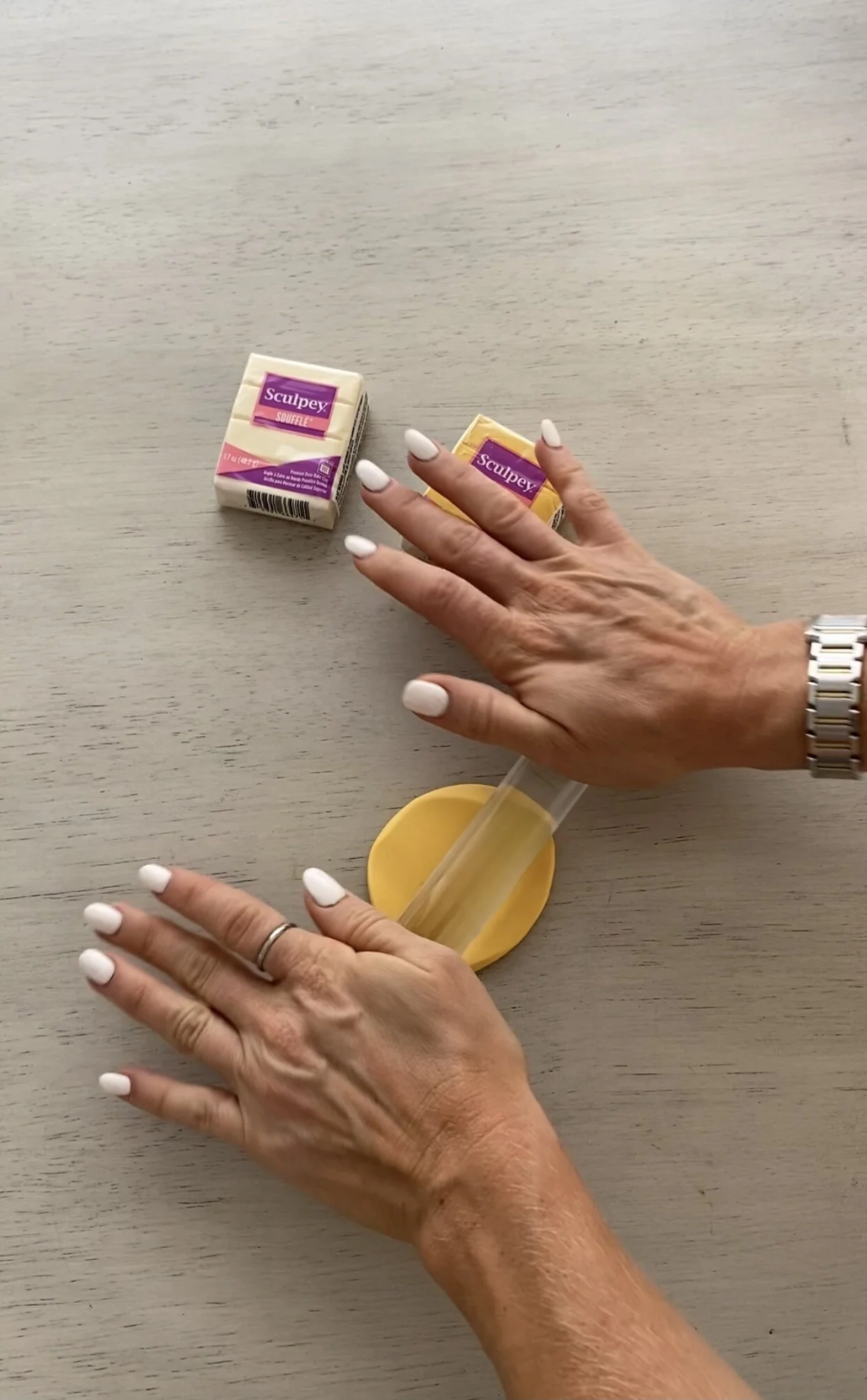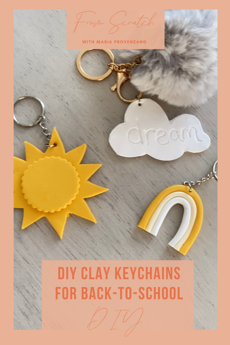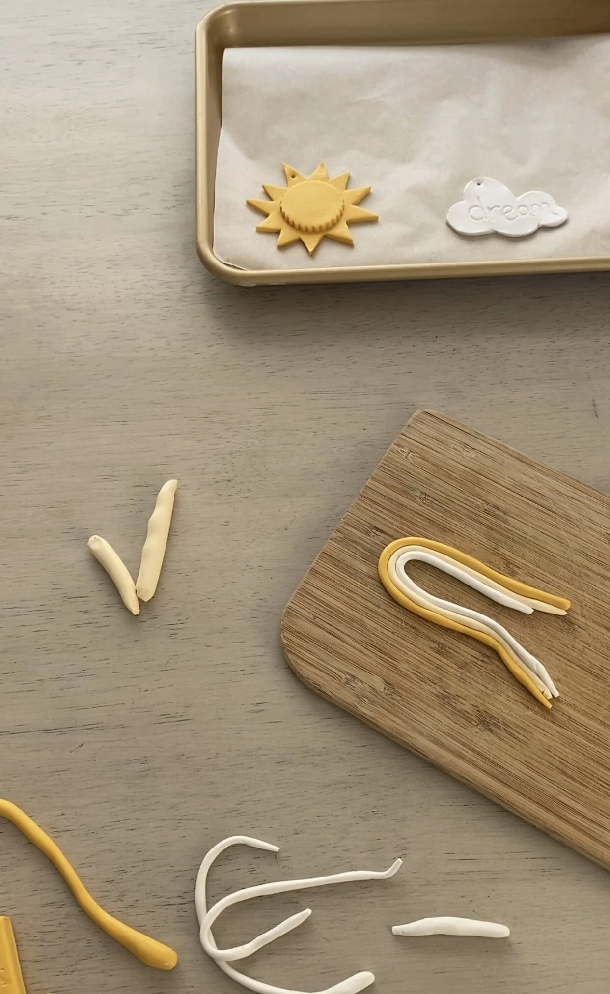 For Grant’s big day, I wanted to do the same thing! So, I default to my favorite craft supply...Sculpey clay! Sculpey has TWO NEW colors in the souffle line and they are WINNERS! There is a beautiful neutral color ivory and a chic yellow ochre that are beautiful alone but also mix and match perfectly with the other colors in the Sculpey line as well. Since I call Grant “sunshine” as a term of endearment, I thought it would be cute to create a keychain charm of a sun with the ochre color and add the lettering “shine” on the back. The Sculpey Soufflé clay is a lightweight clay that after baking, has a beautiful suede finish. It is strong and holds detail making it the perfect choice for this craft because it will showcase the lettering I wanted to add. This clay is super flexible and can even be cut and sewn after baking – perfect for embellishing bags, making tags, and so much more!