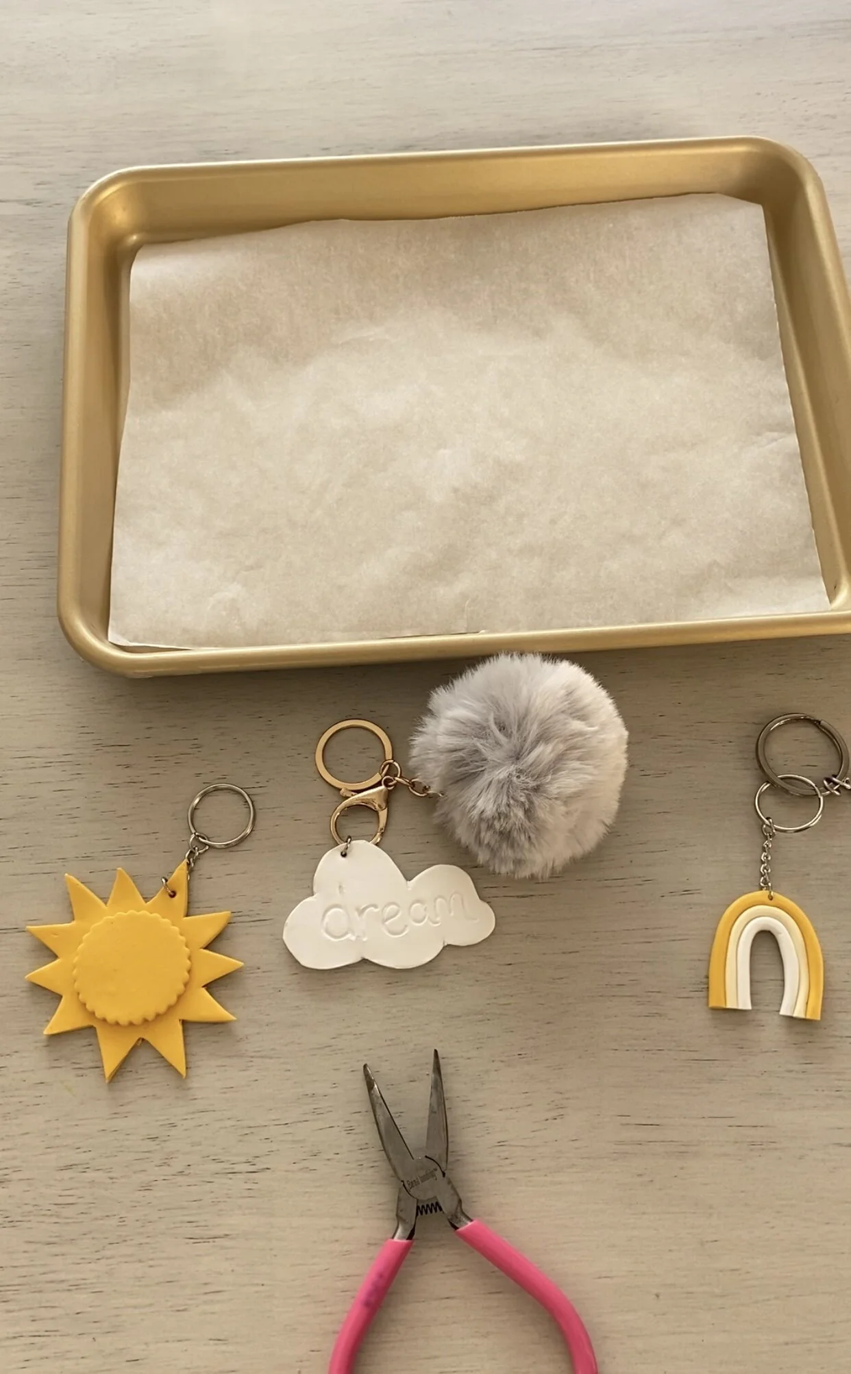 Once baked and cooled, attach the jump ring and key ring by using the jewelry pliers.