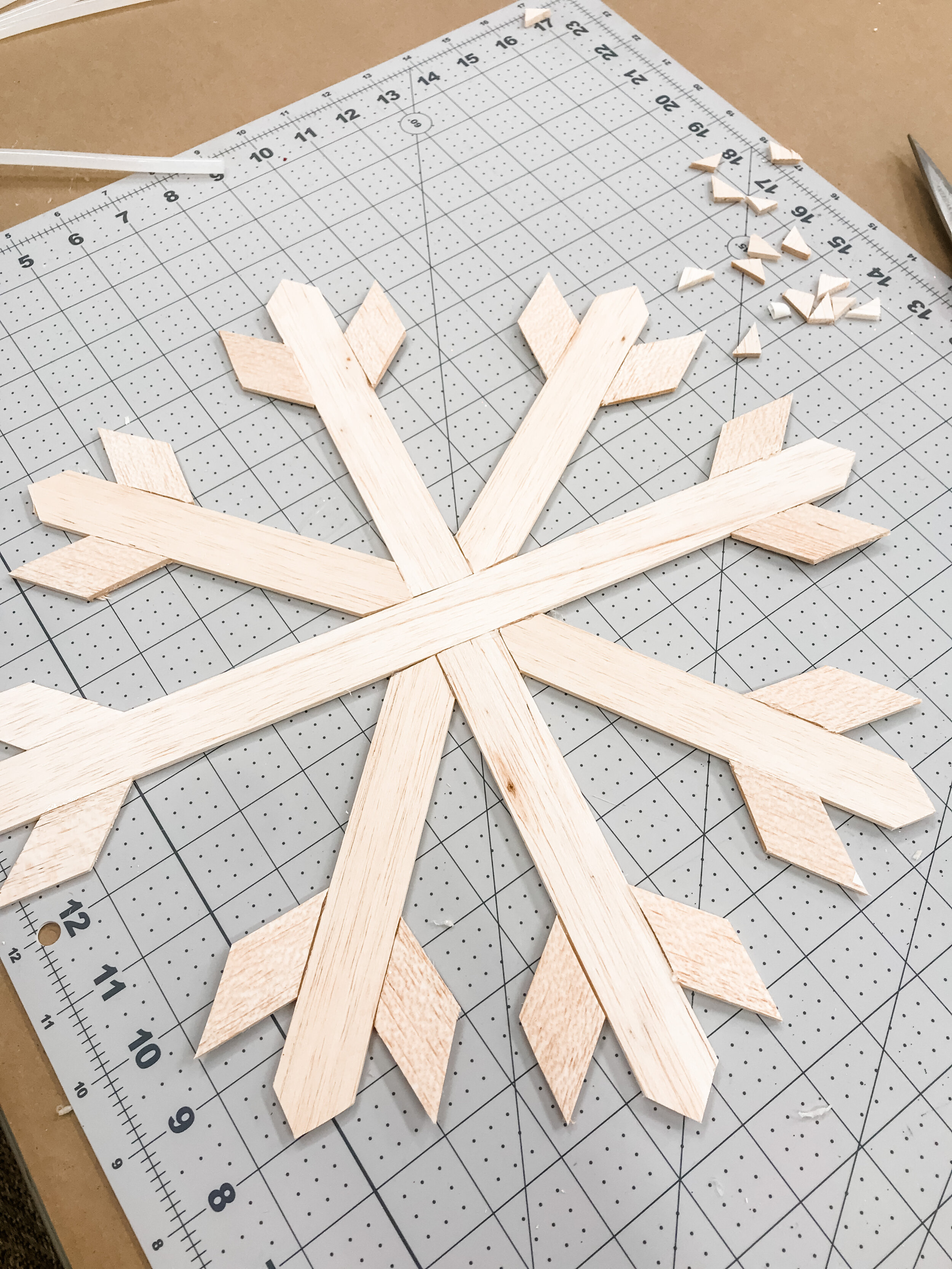 7. To create the detail at the tip of your snowflake points, glue the diagonal pieces on both sides of each stick near the point.