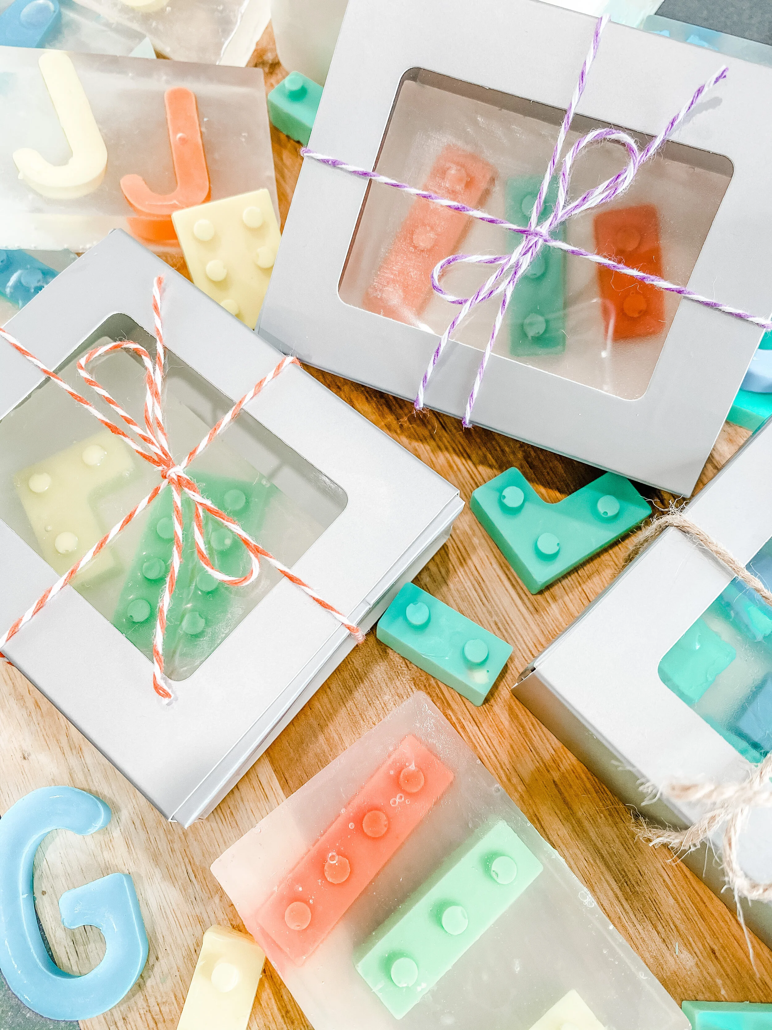*If you want to create the soap where the legos are inside the clear soap, then be sure to let the glycerin soap cool enough before pouring, otherwise it will melt the shapes that you have in the molds (it helps to refer to the video for this part). This can also be done by pouring the glycerin into the rectangle-shaped molds and once it’s cooled a bit, then add drop the lego-shaped soaps into the molds until they are submerged.