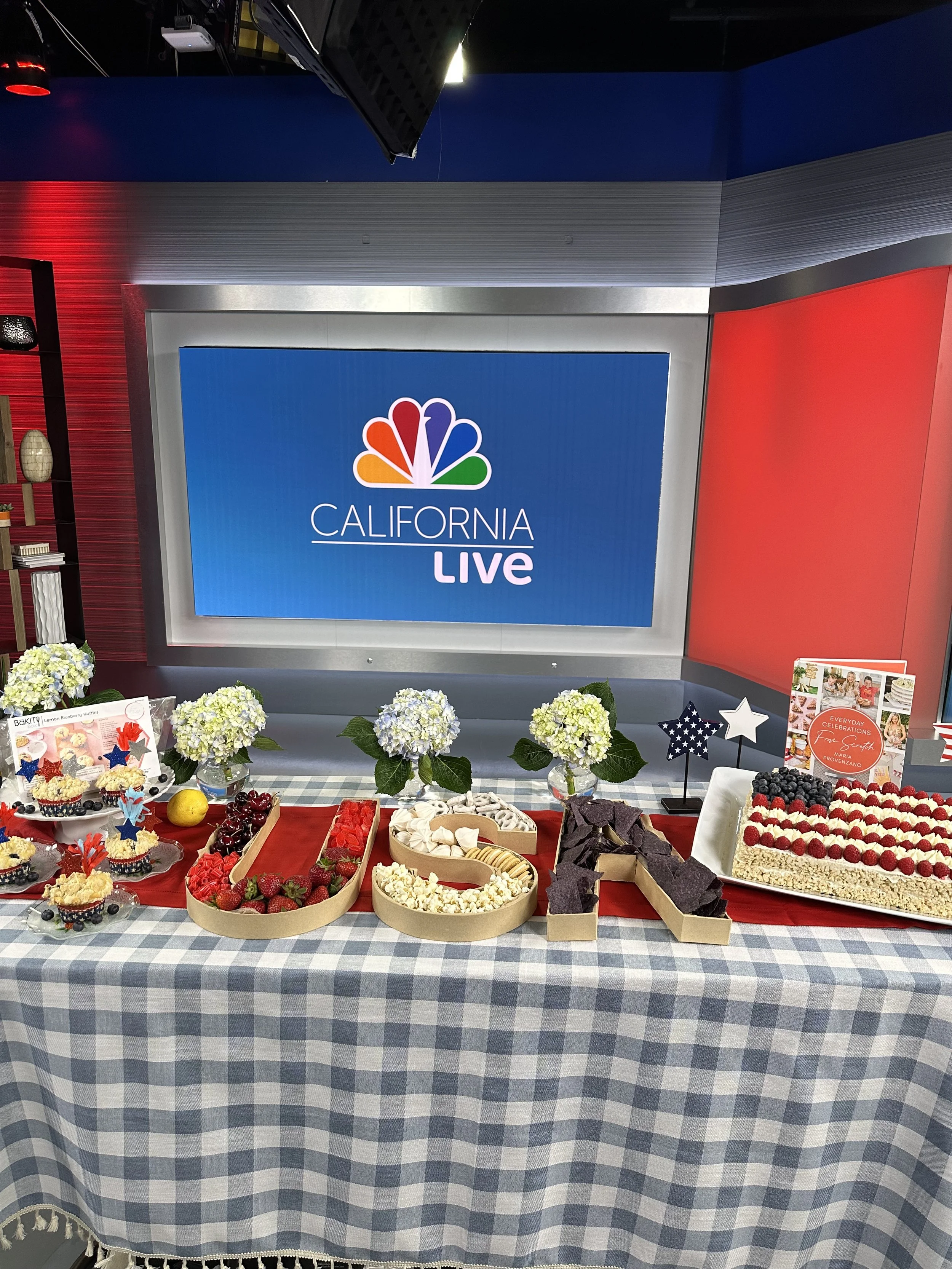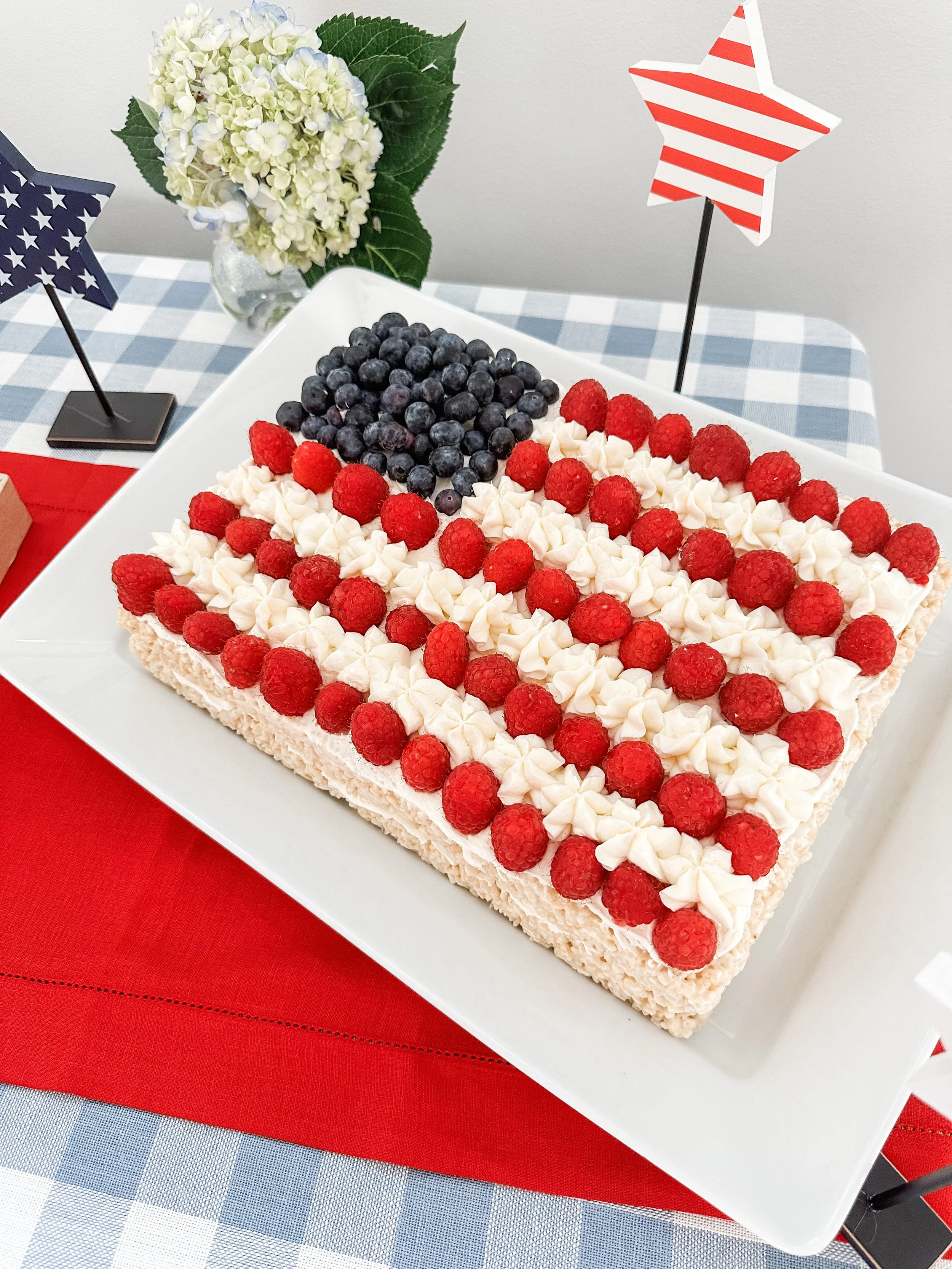 Add this to your 4th of July menu and be ready to impress! It all starts with two batches of Rice Krispie treats pressed into a 9x13-inch pan. Then, two batches of my buttercream recipe, blueberries, and strawberries make up the decorations on the top. I made this beauty for CA Live along with other 4th of July ideas. Be sure to watch the video below for the tutorial and scroll down for the steps.